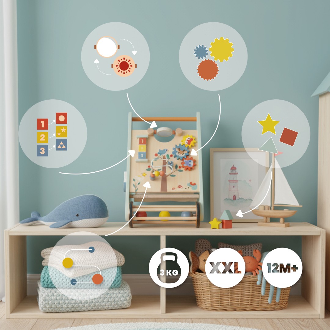 Interaktywne elementy, takie jak sorter, przeplatanka koralików, klocki z liczbami, lusterko oraz zakręcone trybiki, nie tylko bawią dziecko, ale także stymulują jego zmysły i rozwijają umiejętności motoryczne. Dzięki nim maluch może eksplorować różnorodne formy i tekstury, ucząc się jednocześnie rozpoznawania kształtów, liczb i kolorów.