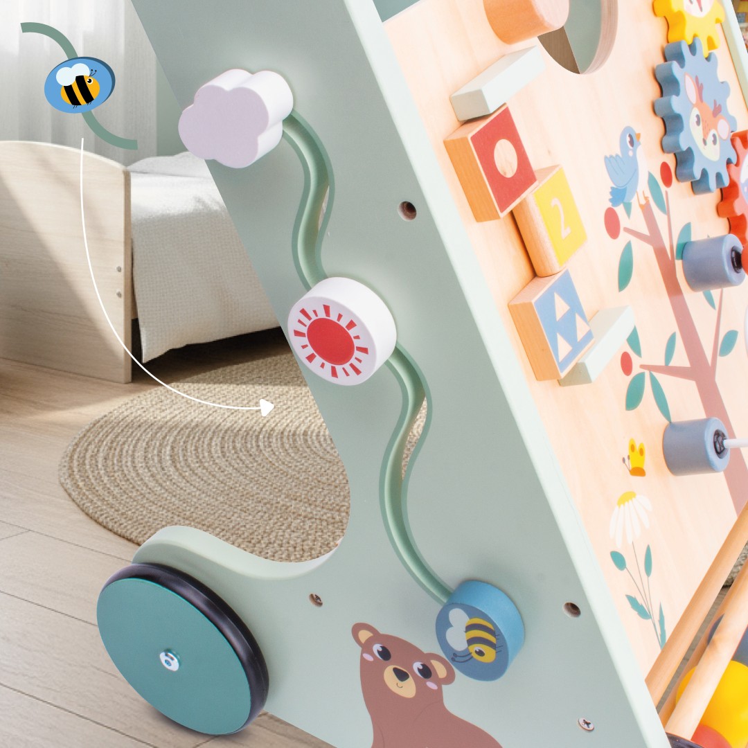 ✔️ posiada wiele elementów interaktywnych: sorter, przeplatankę koralików, klocki z liczbami, zakręcone trybiki, lusterko