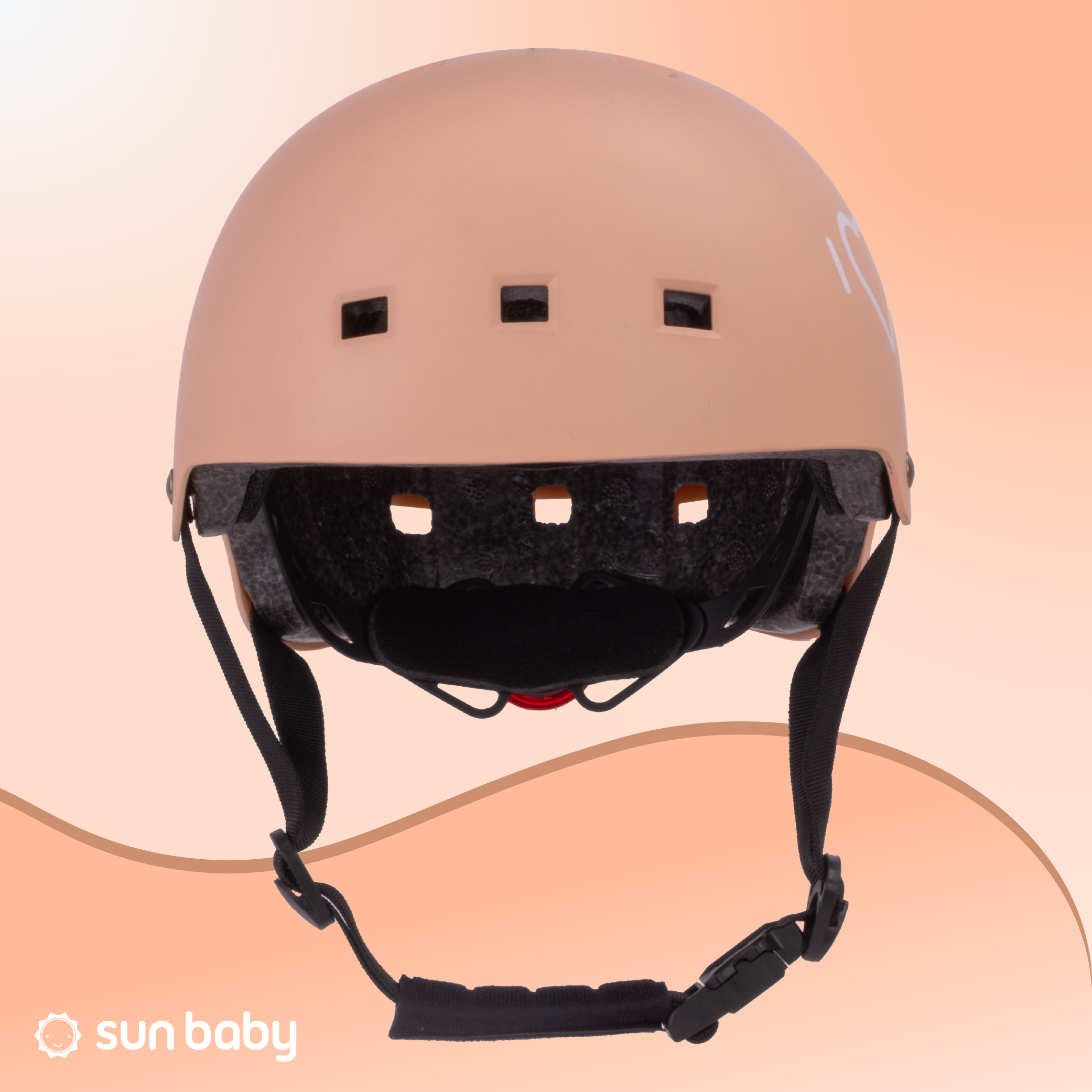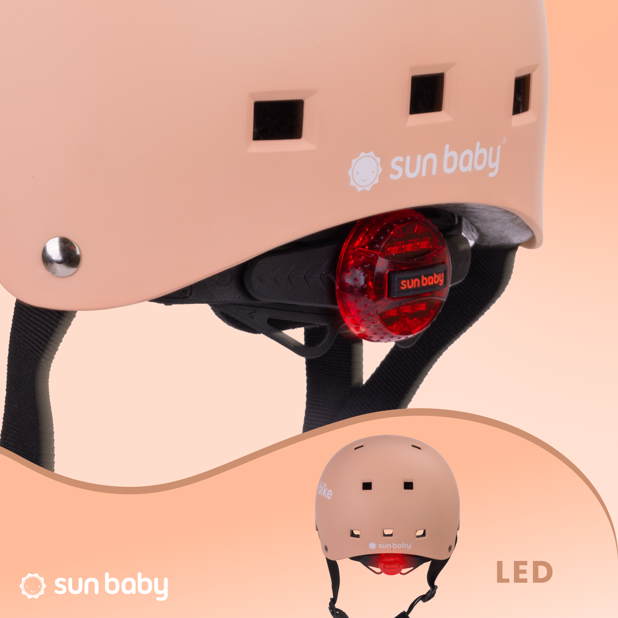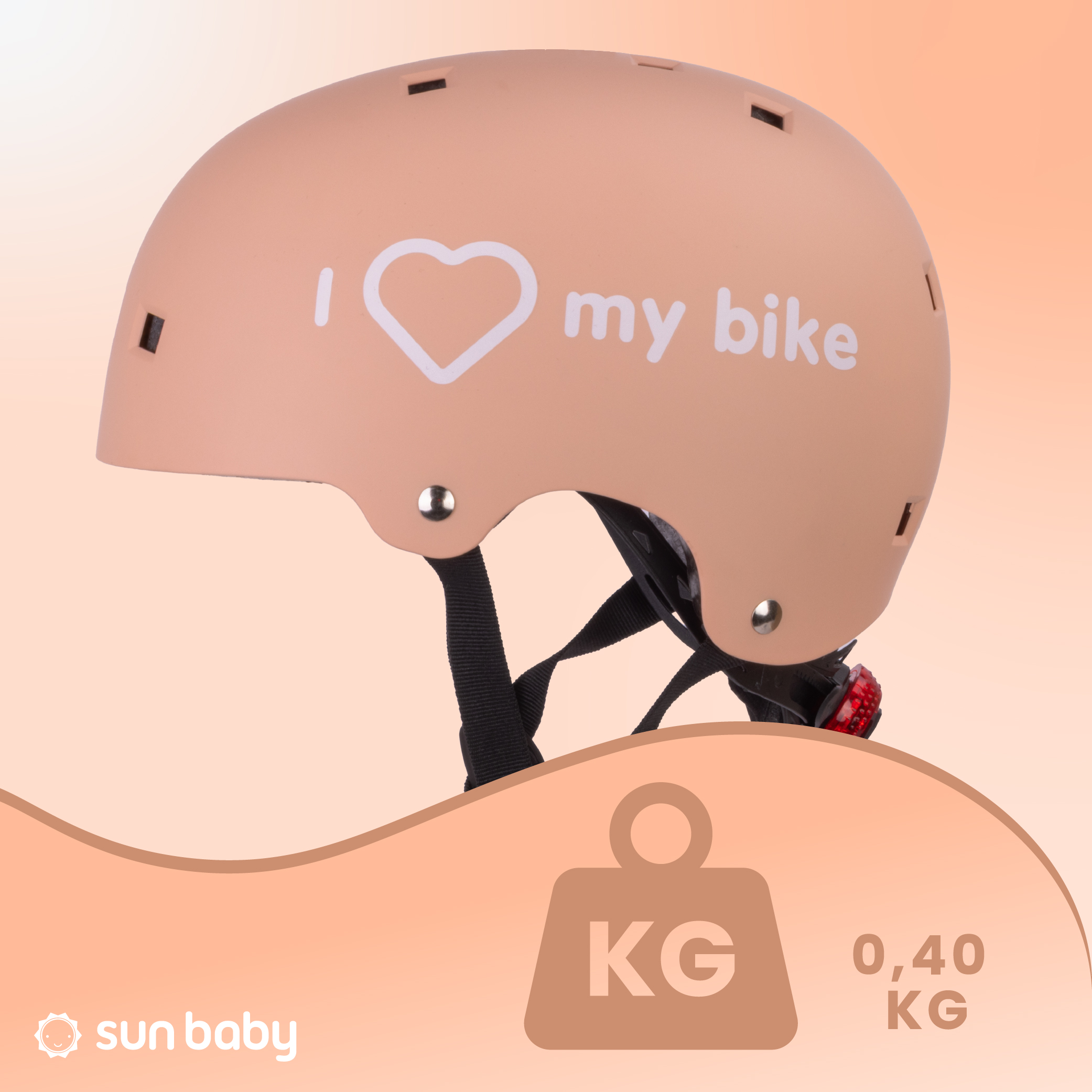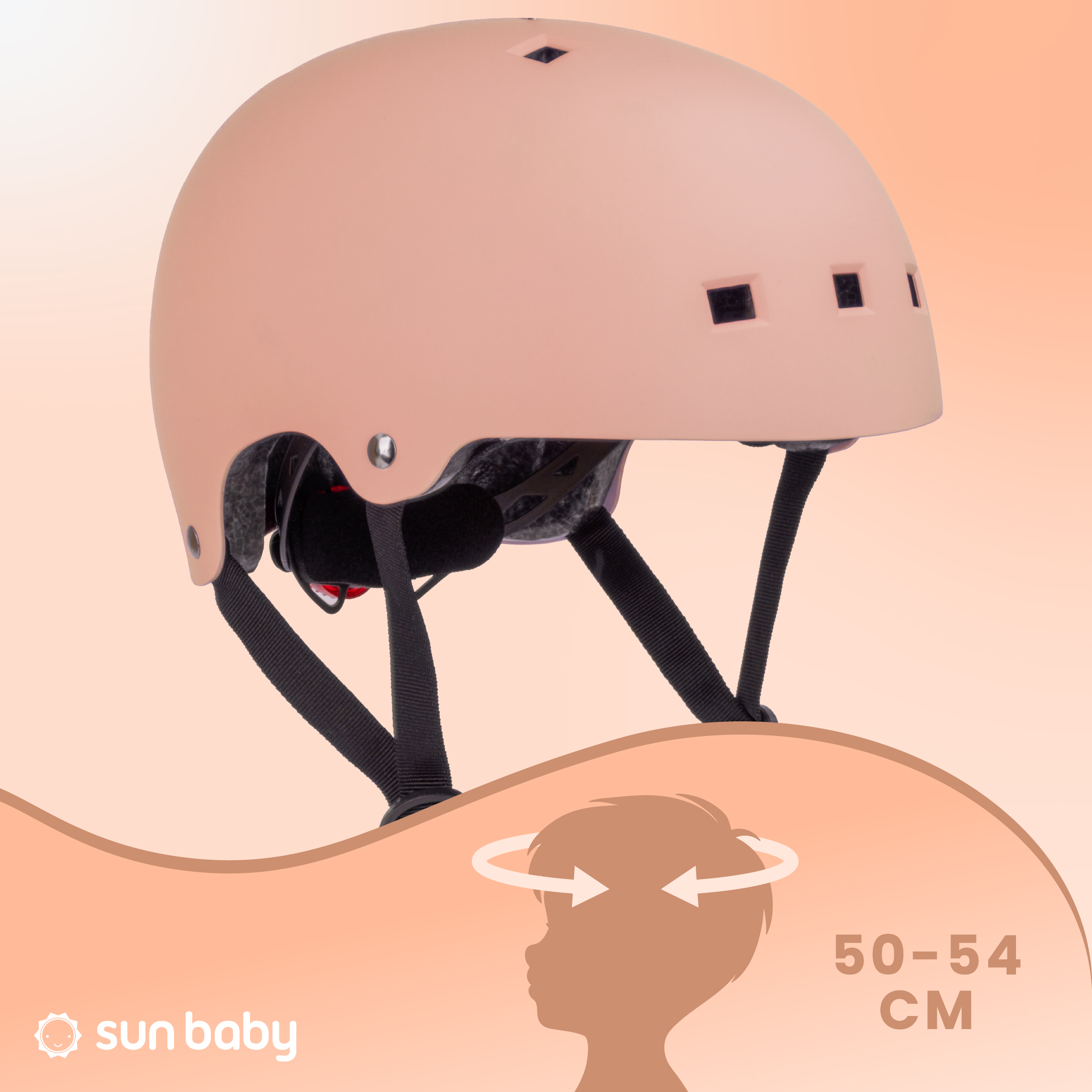 Kask rowerowy dla dzieci Ochronny Regulowany na hulajnogę deskorolkę S 50-54 cm lampka LED klips magnetyczny Morelowy
