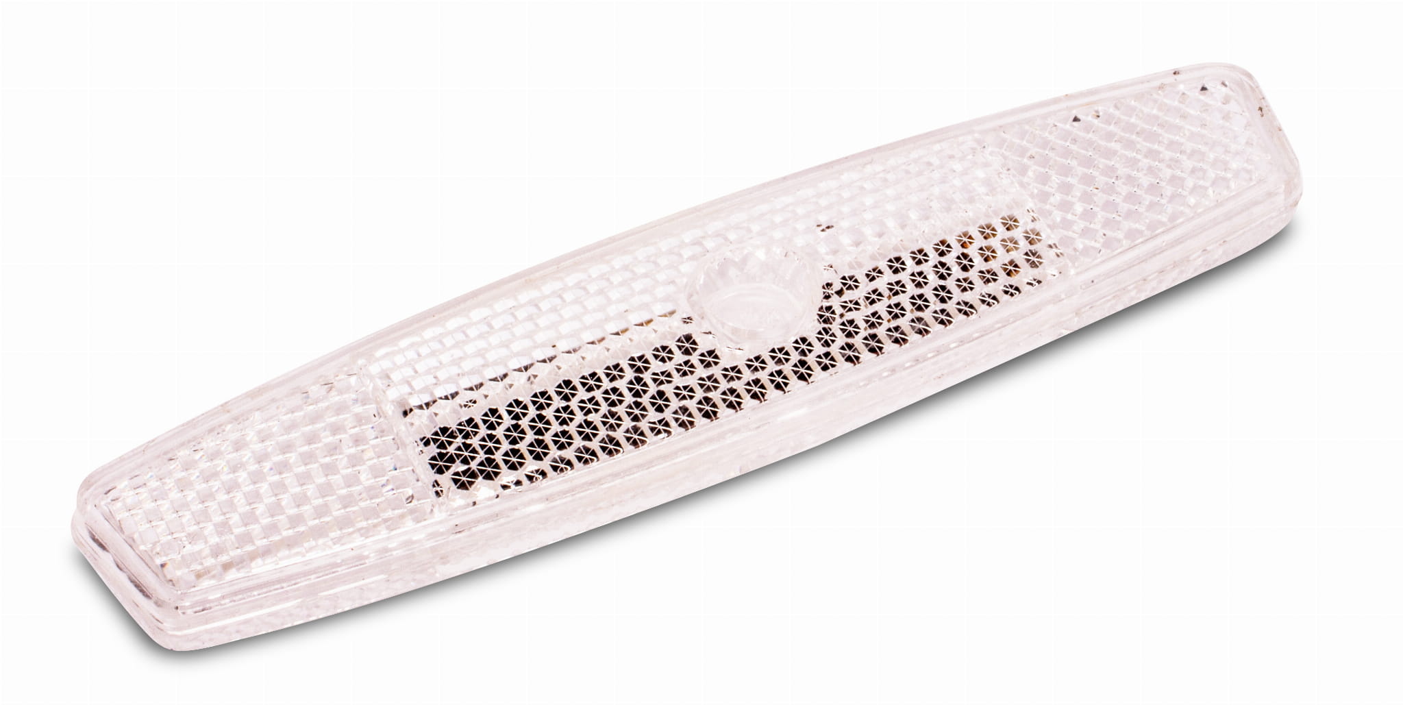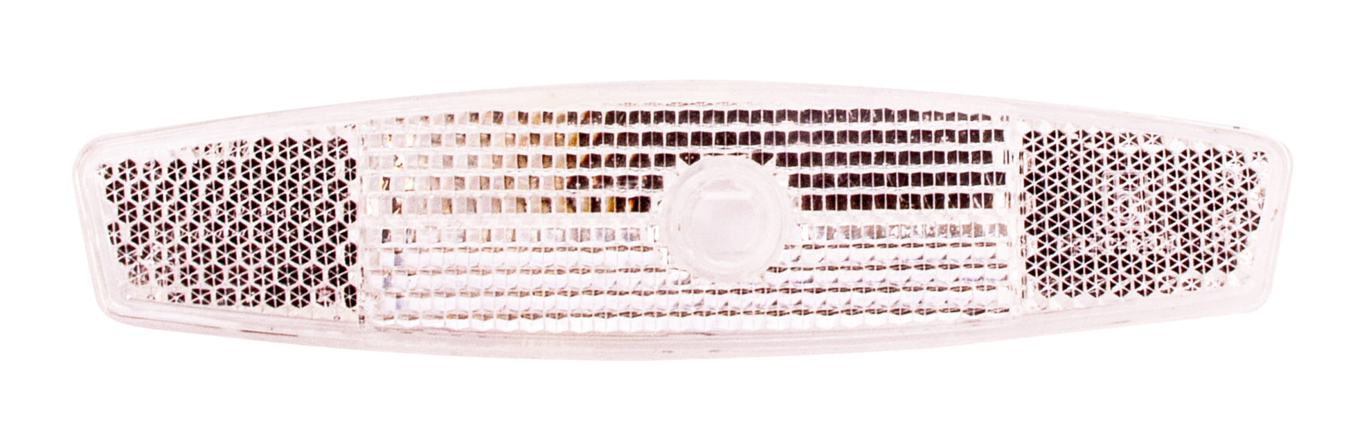 Ten biały odblask rowerowy ma wydłużony, prostokątny kształt, co zapewnia lepszą widoczność na drodze, zwłaszcza podczas nocnych przejażdżek lub w warunkach słabego oświetlenia.