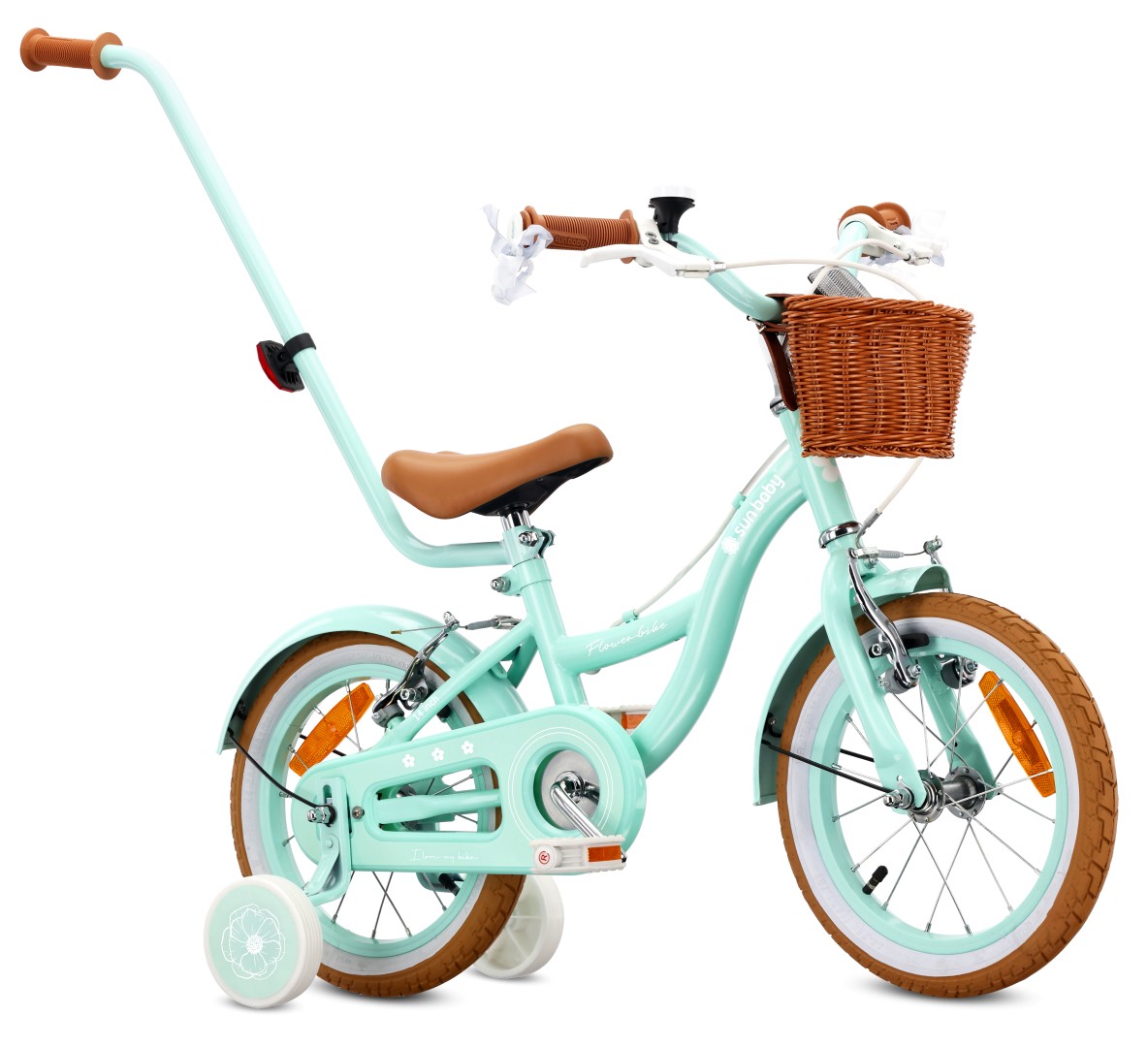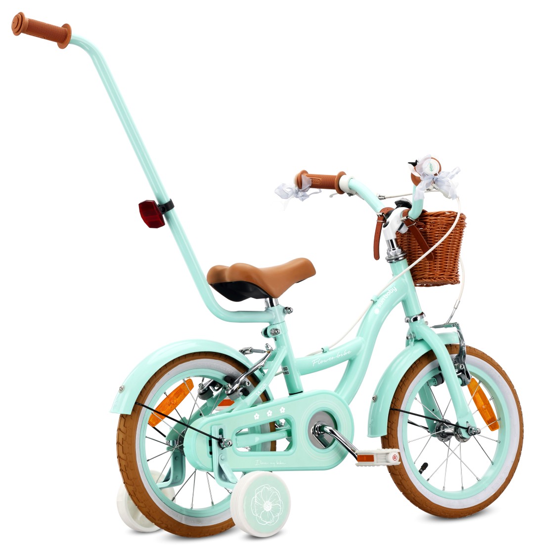Rower dziecięcy 14 cali dla dziewczynki 3 4 5 lat Pchacz Kółka boczne Koszyk V-brake Flower Retro bike miętowy