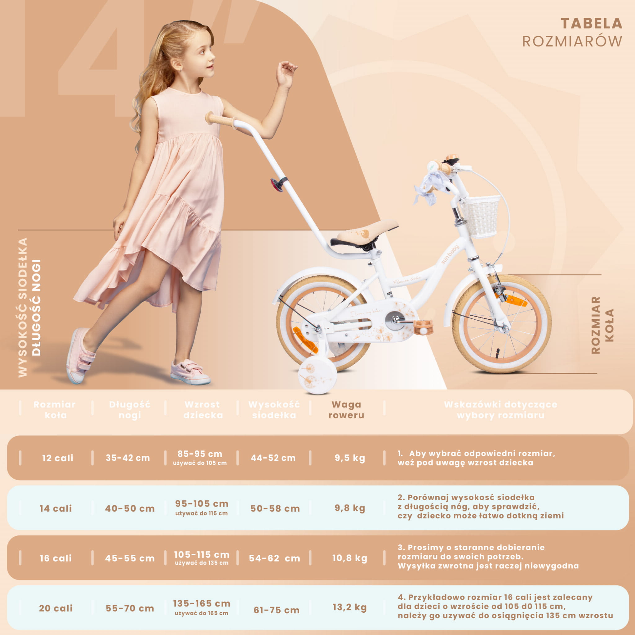 Rower dla dziewczynki 14 cali Pchacz Kółka boczne Koszyk Flower bike Dmuchawiec biało beżowy Sun Baby