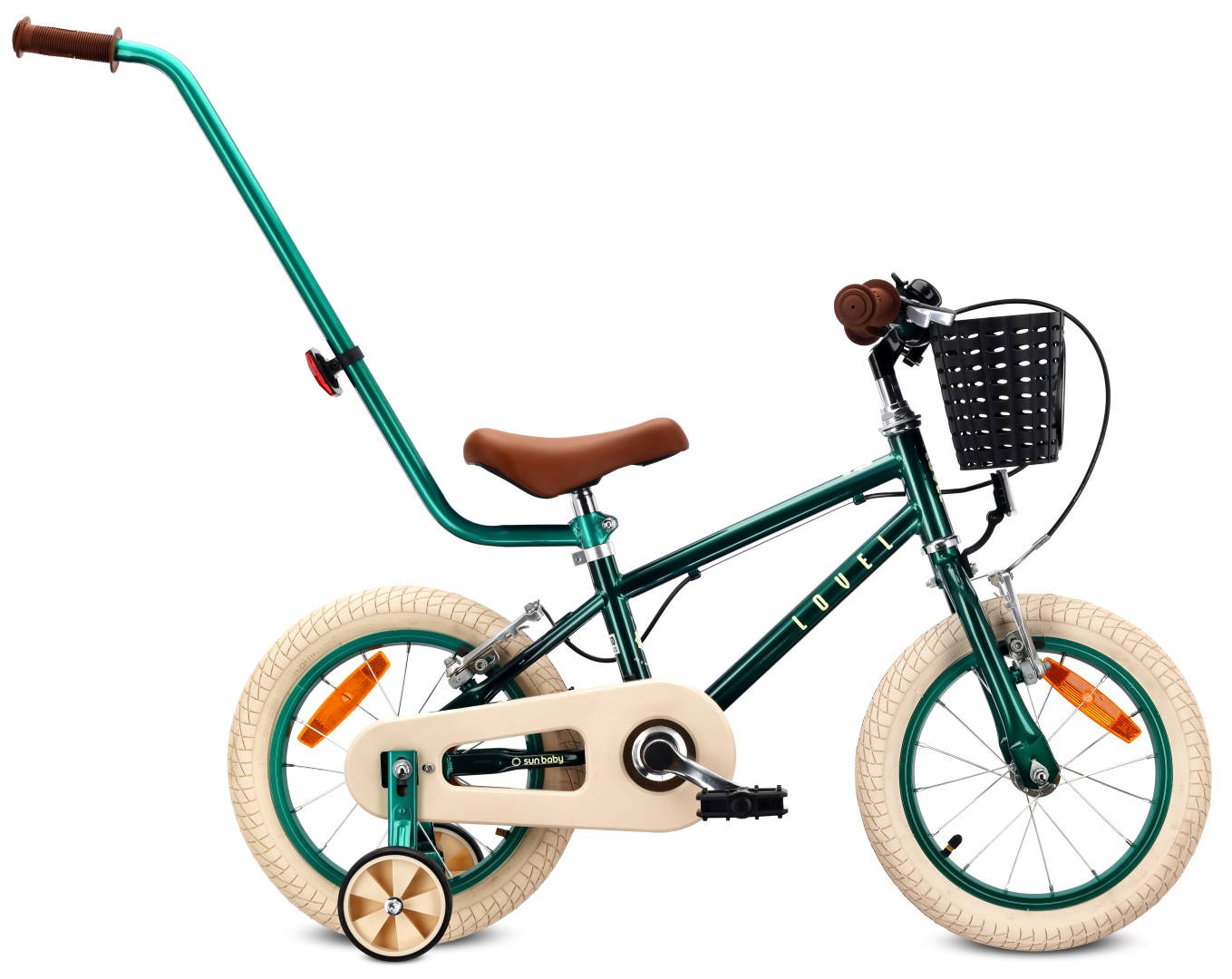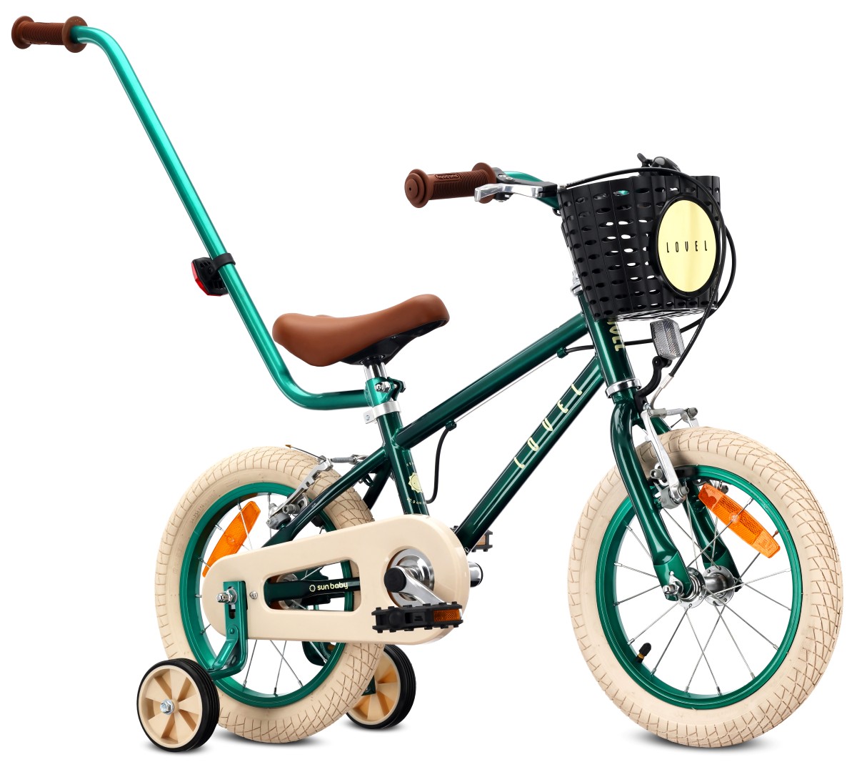 Rower dziecięcy LOVEL 14 cali dla chłopca z kółkami bocznymi, koszykiem i prowadnikiem