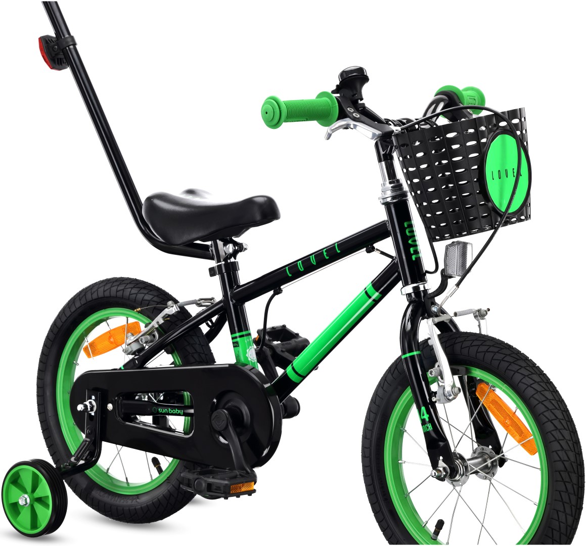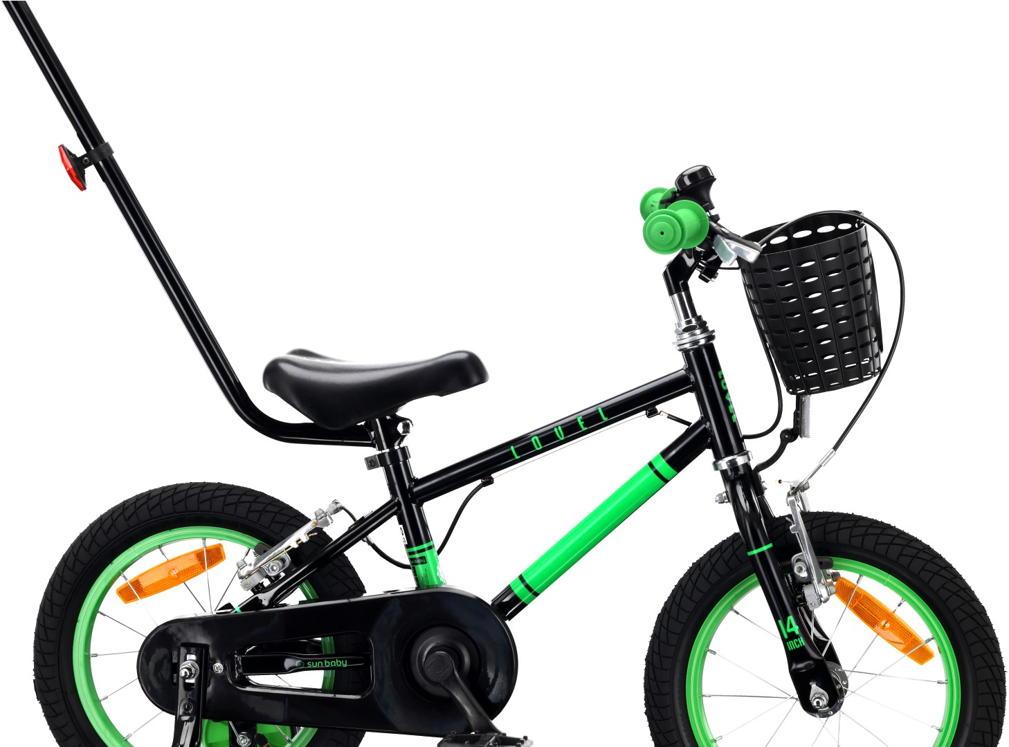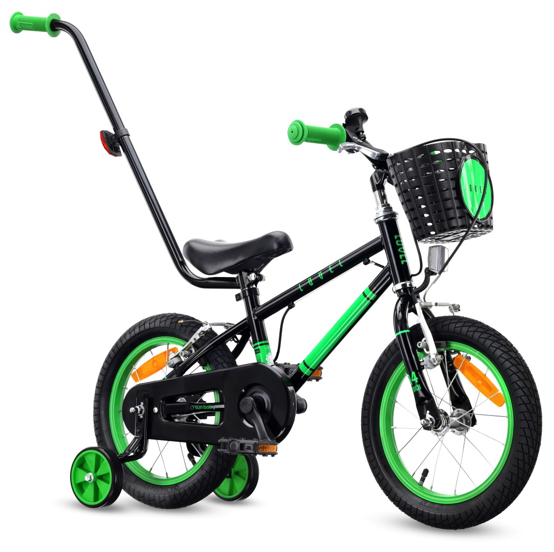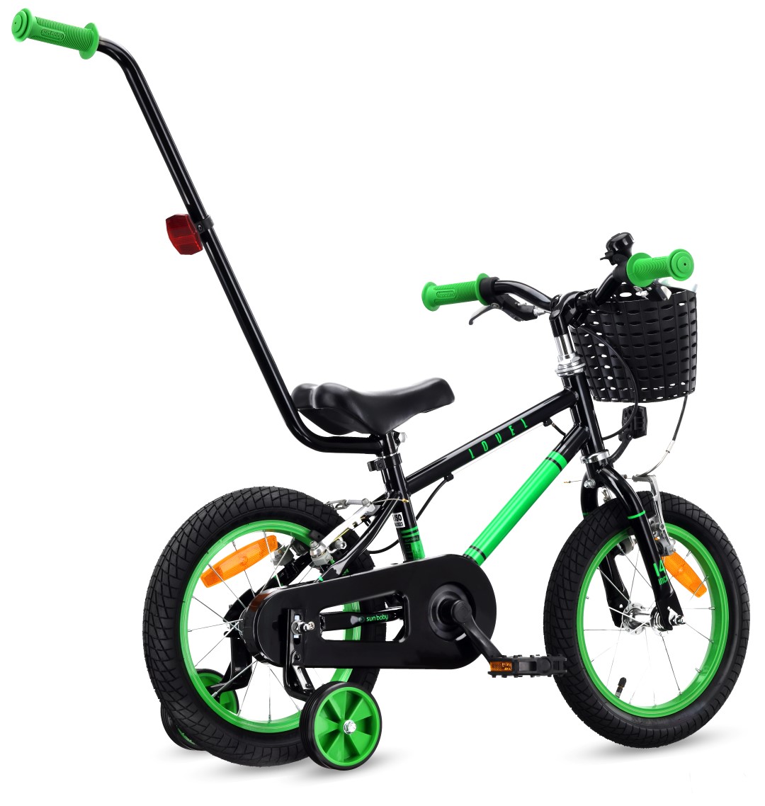 Rower dziecięcy 14 cali dla chłopca 3 4 5 lat Prowadnik Kółka boczne Koszyk V-brake LOVEL czarny zielony