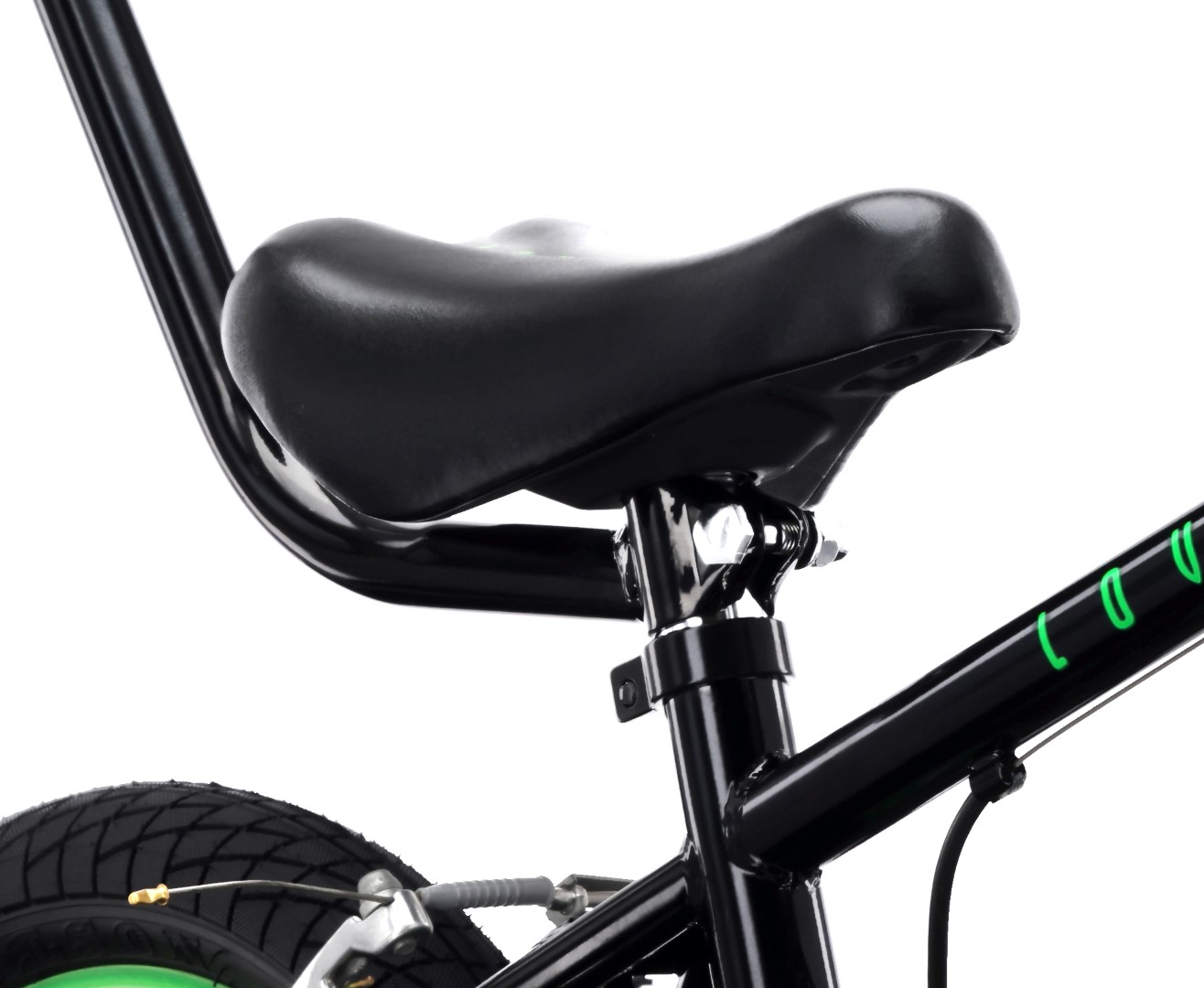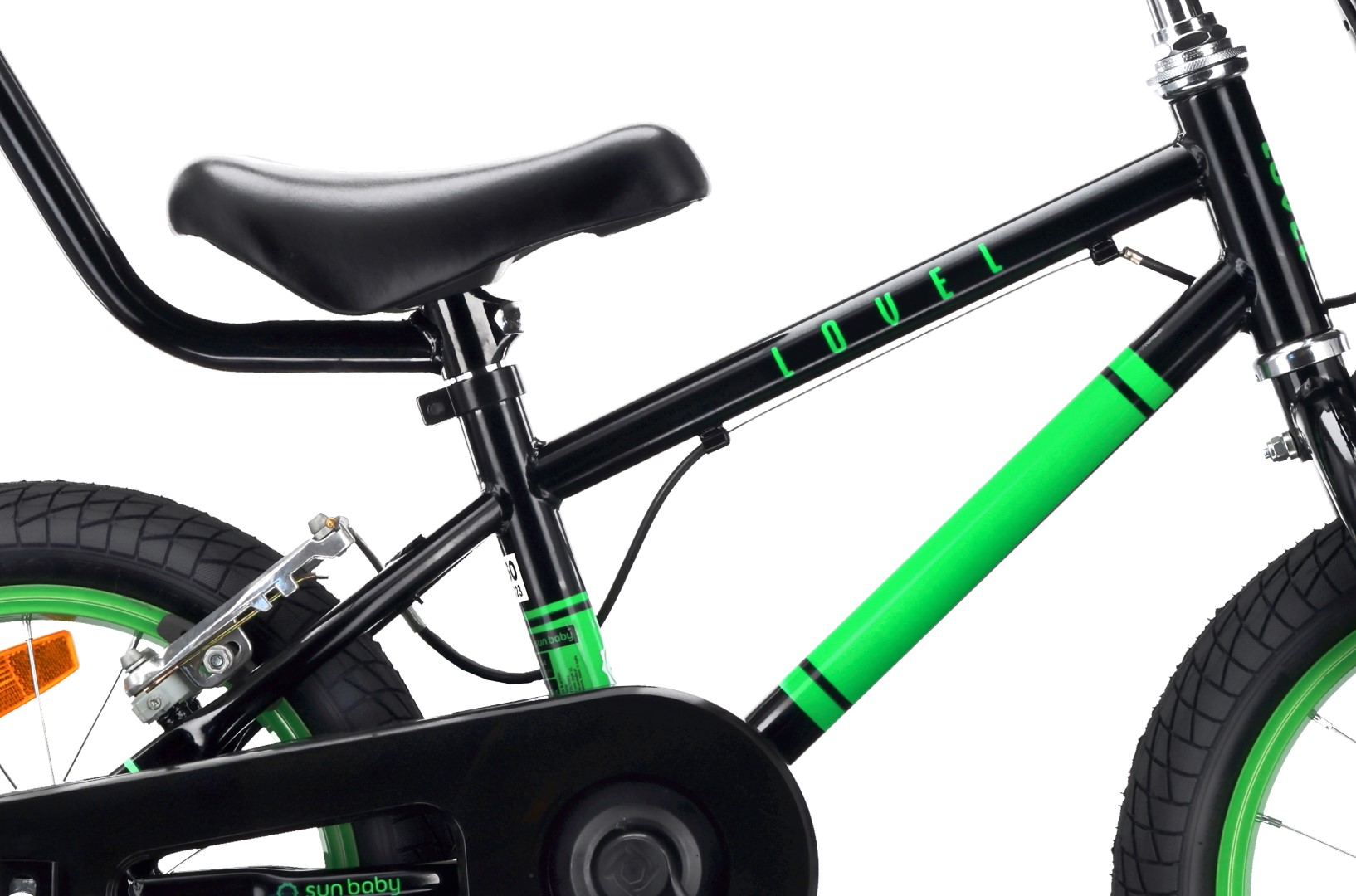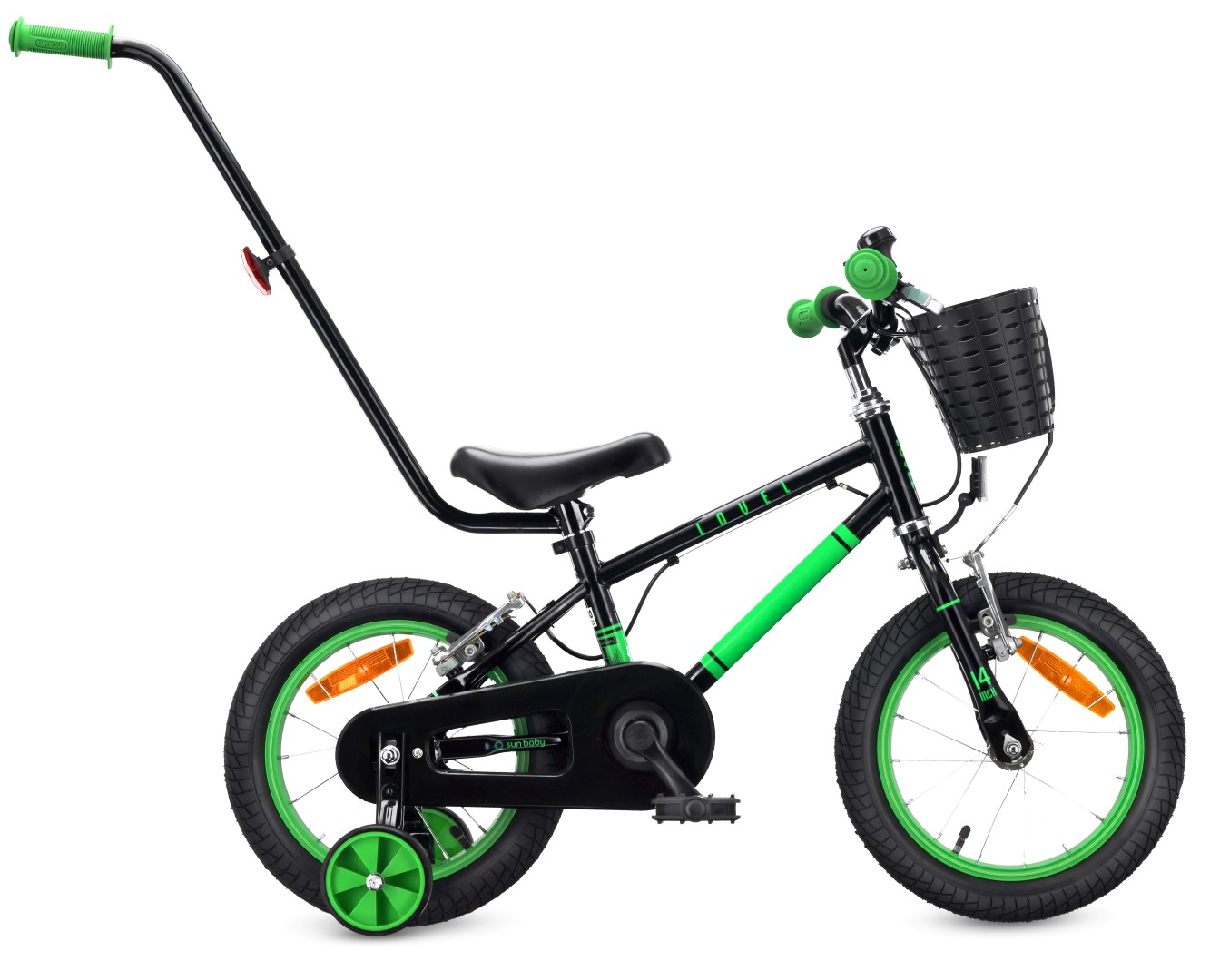 Rower dziecięcy 14 cali dla chłopca 3 4 5 lat Prowadnik Kółka boczne Koszyk V-brake LOVEL czarny zielony