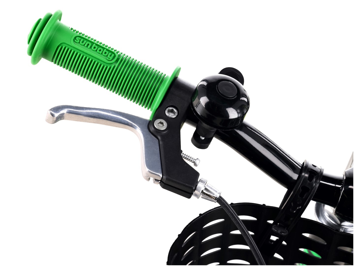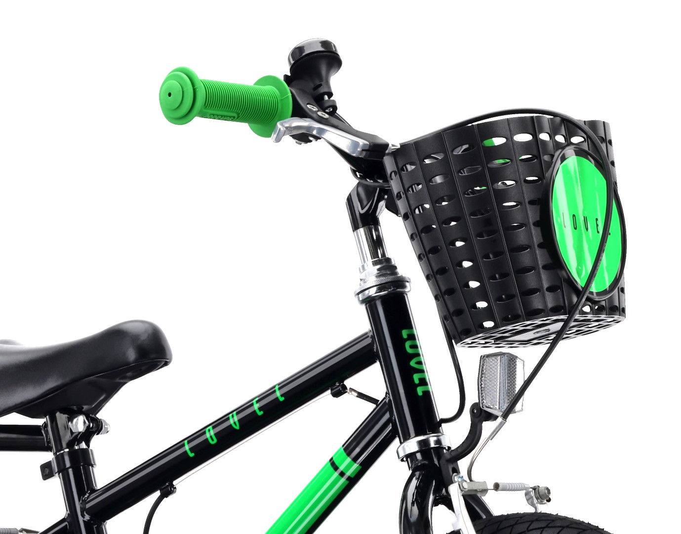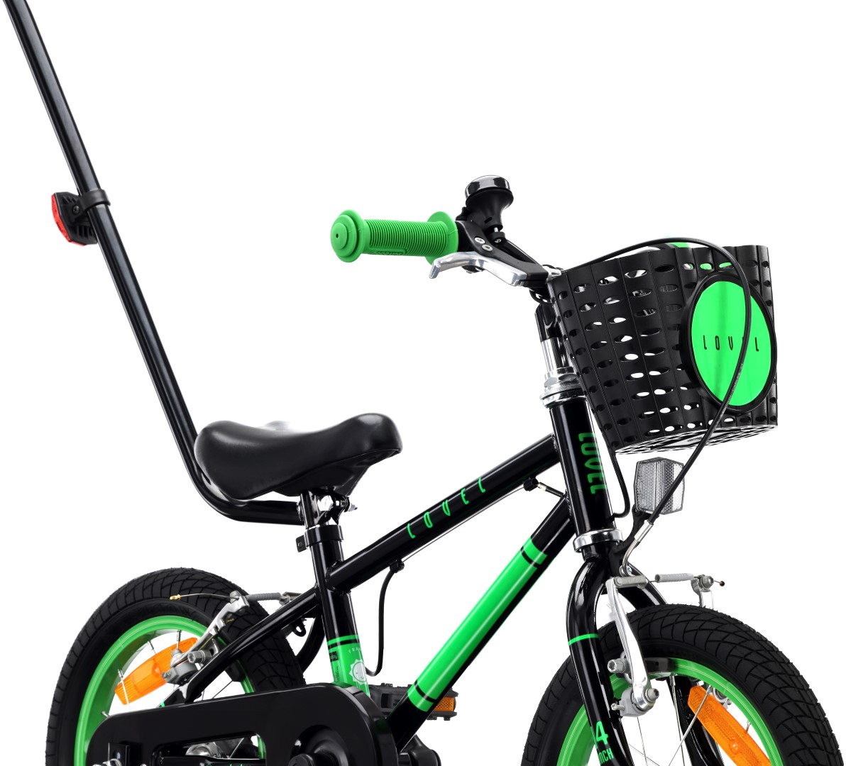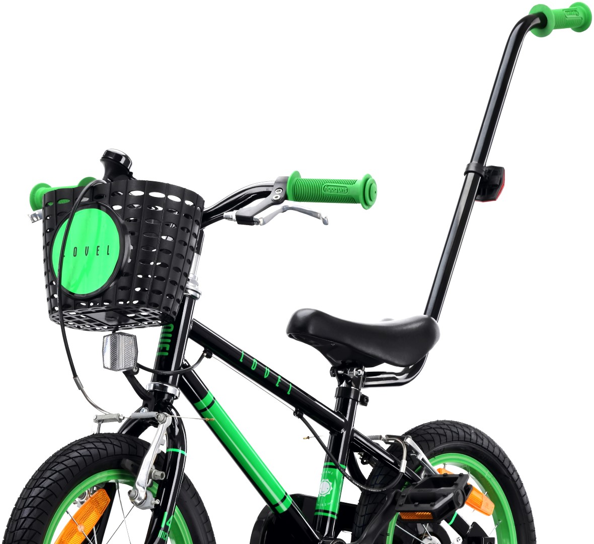 Rower dziecięcy 14 cali dla chłopca Prowadnik Kółka boczne Koszyk Dzwonek V-brake LOVEL czarny zielony