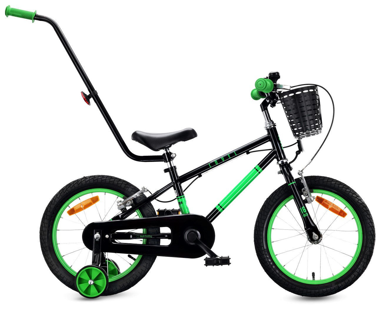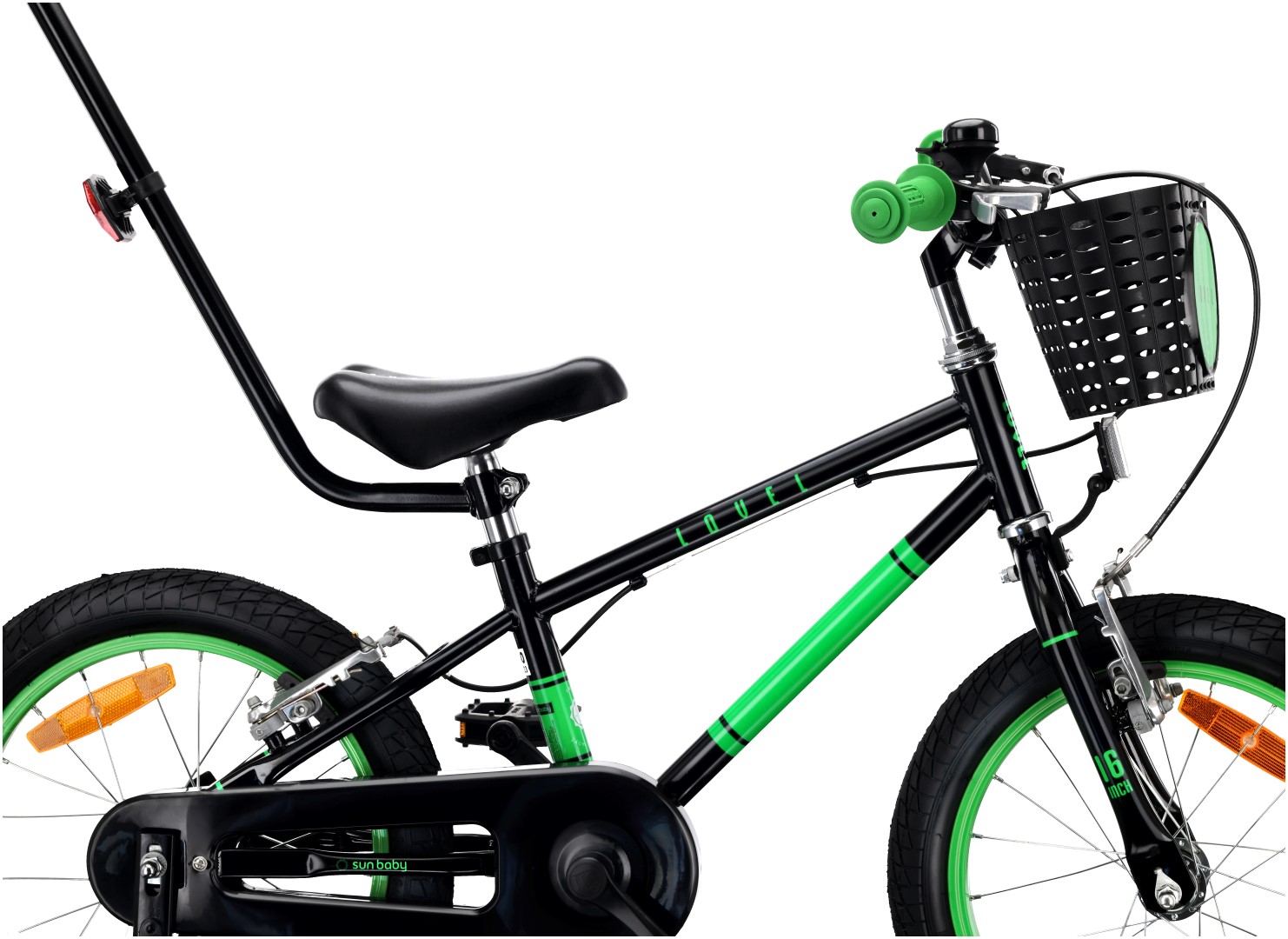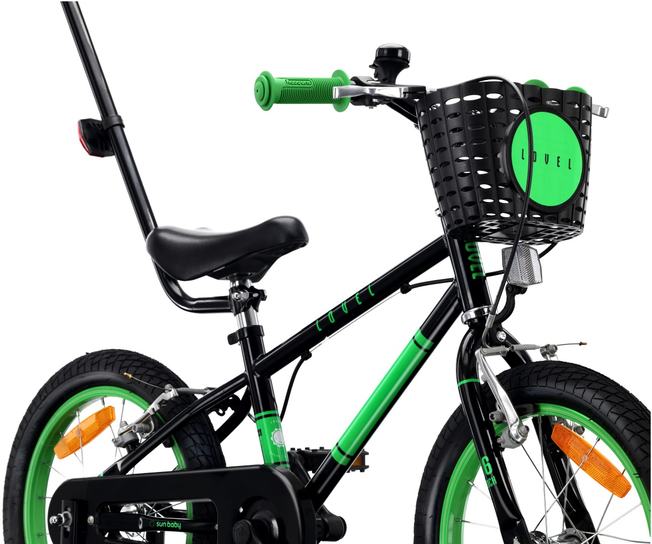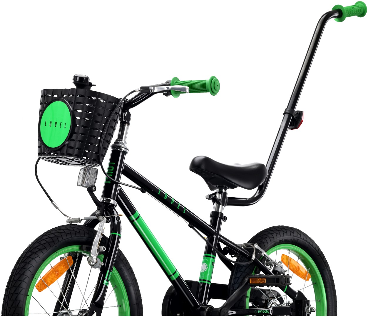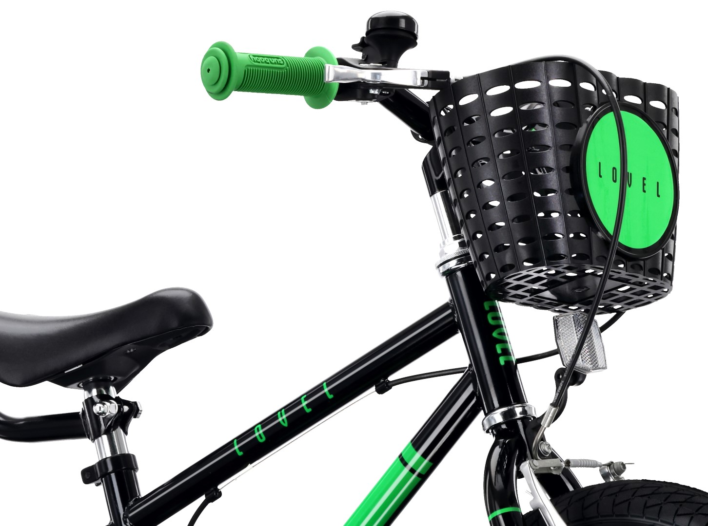 Rower dziecięcy 16 cali dla chłopca Prowadnik Kółka boczne Koszyk Dzwonek V-brake LOVEL czarny zielony