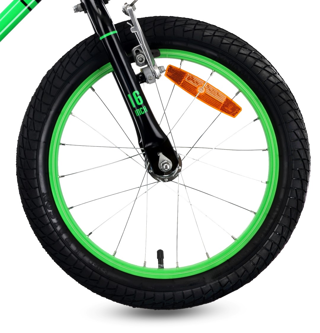 Hamulce V-brake z przodu i z tyłu zapewniają pewne i skuteczne hamowanie w każdych warunkach. Osłona łańcucha chroni ubrania dziecka, a odblaski zwiększają widoczność podczas jazdy.
