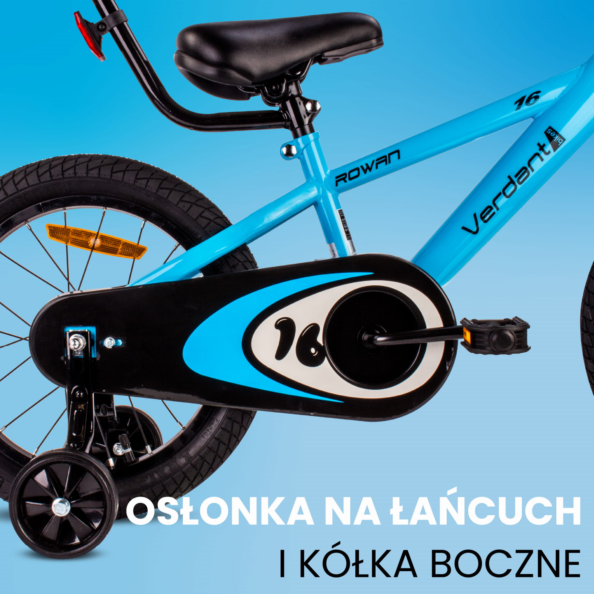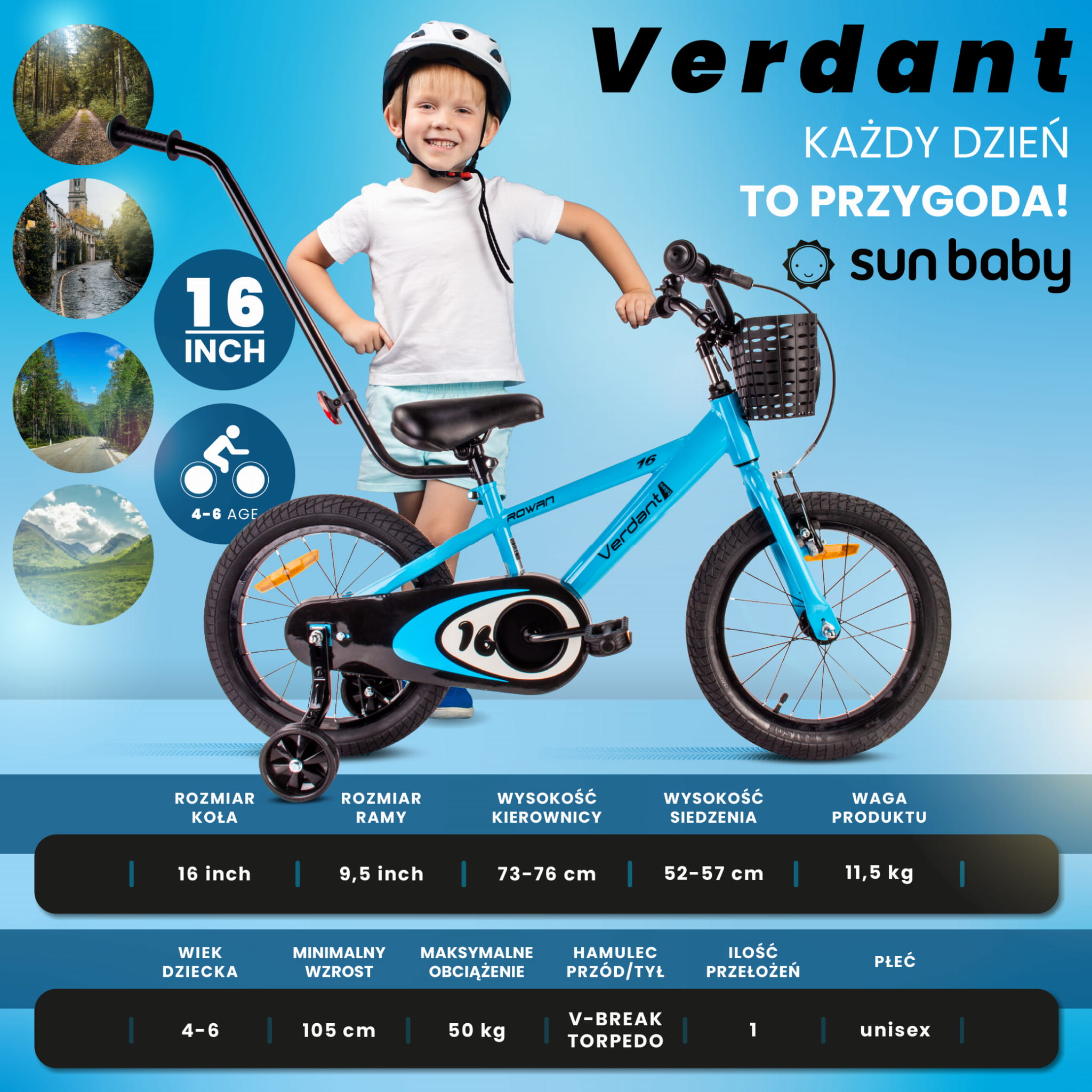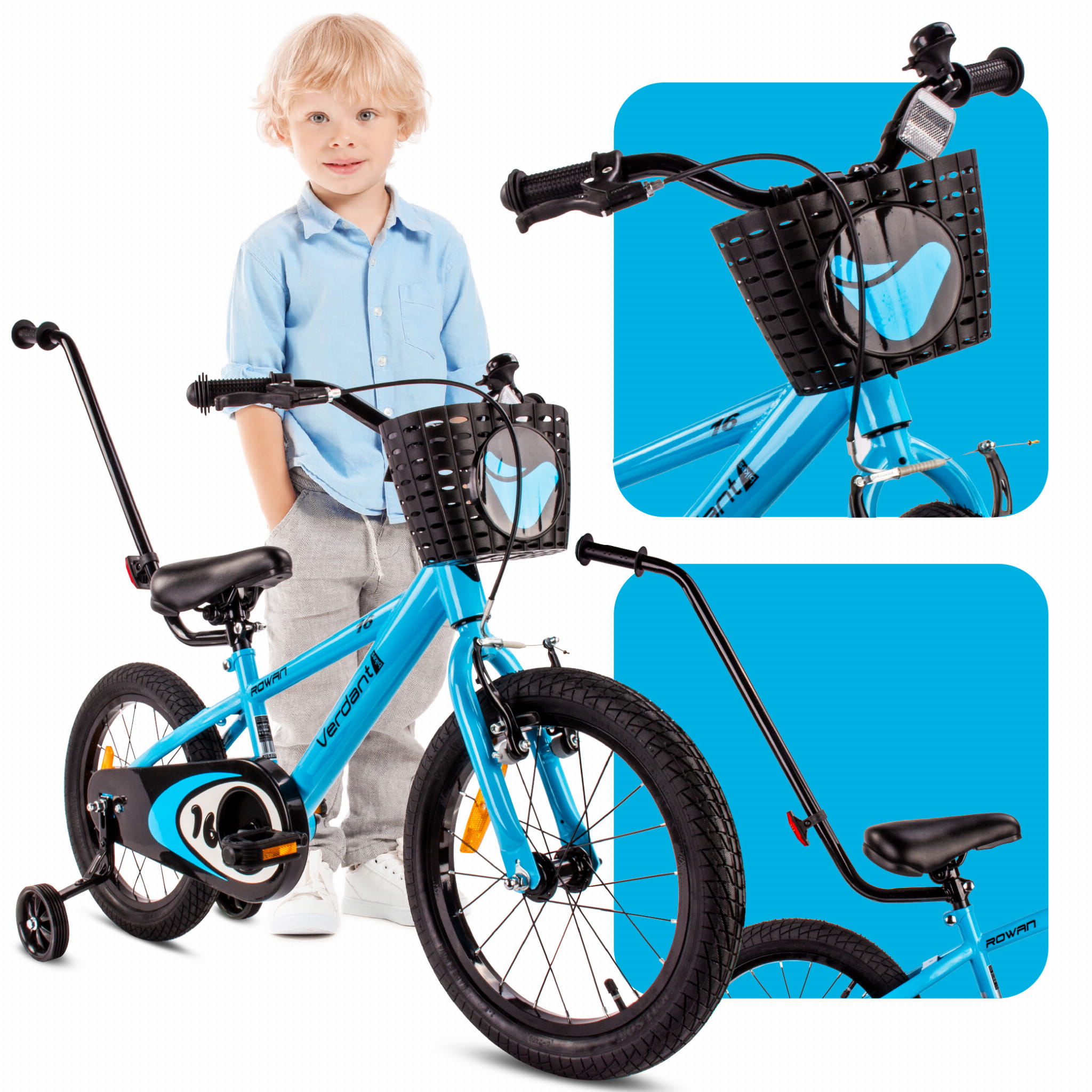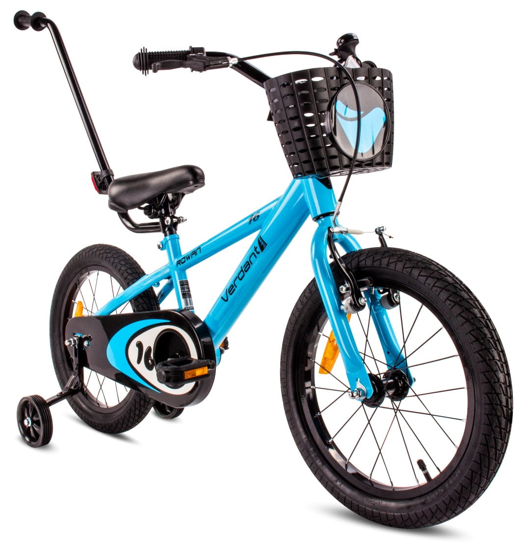 Rower dziecięcy 16 cali dla chłopca Prowadnik Kółka boczne Koszyk Verdant Rowan niebieski