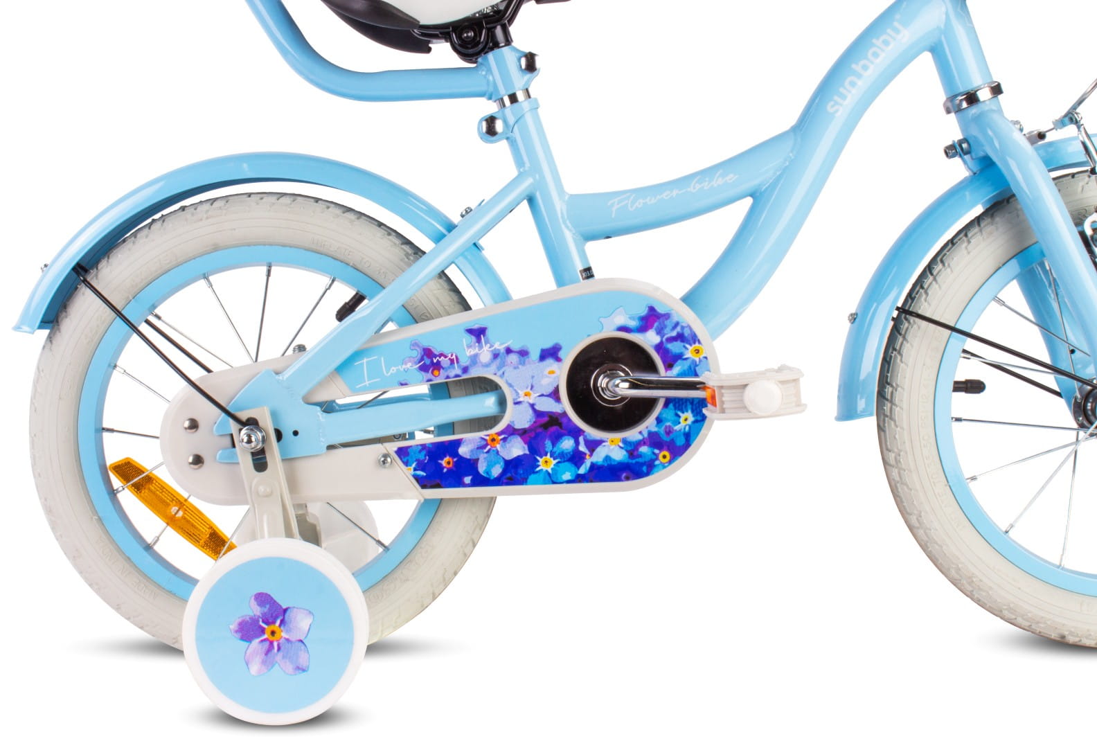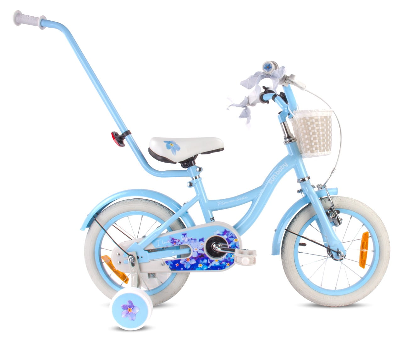 Sun Baby Rower dziecięcy 16 cali dla dziewczynki Pchacz Koszyk Kółka boczne 4-6 lat Flower Bike niezapominajka niebieski