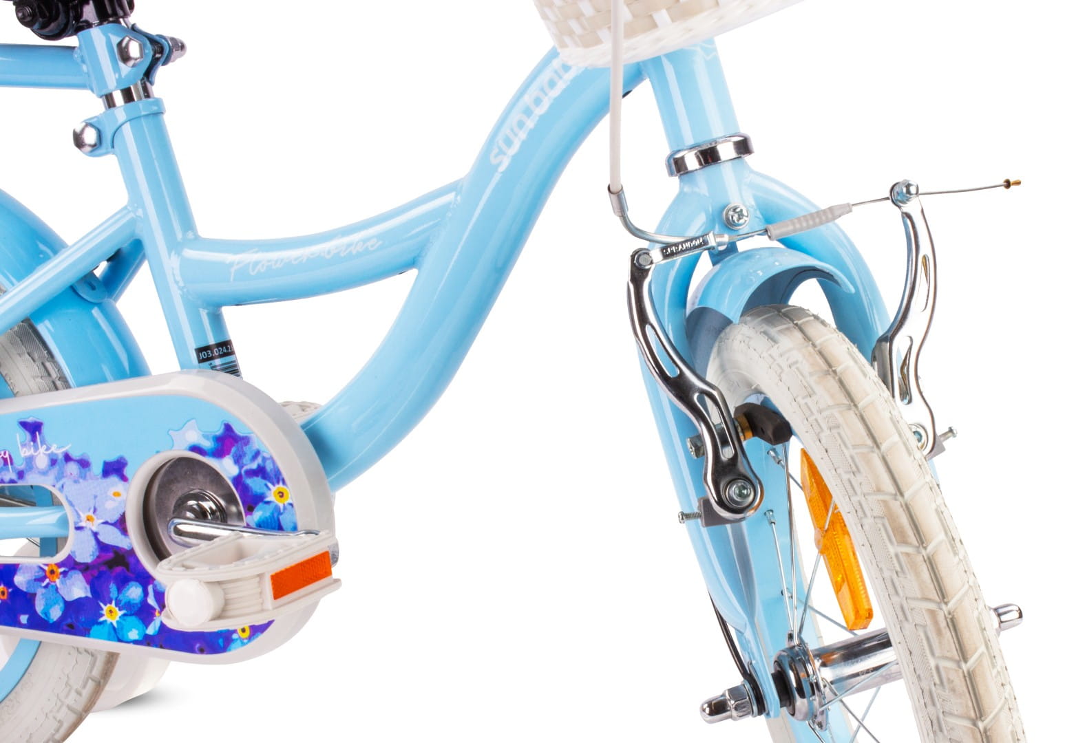 Długie ramię hamulca V-brake sprawia, że lekkie naciśnięcie klamki hamulca daje dużą siłę hamowania i niezawodne działanie nawet na mokrej obręczy. Rowerek Flower Bike jest wyposażony w hamulec V-brake przedniego koła.